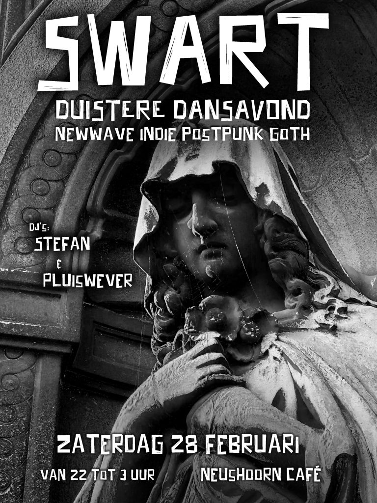 Dj’s Stefan 1970 en Pluiswever draaien de hele avond platen geplukt uit genres als new wave, postpunk, EBM, gothic, electroclash, darkwave en andere swarte muziek dwars door de verschillende decennia heen. Van The Cure tot IST IST en van Joy Division tot Mareux: ze maken er één dansbaar geheel van.